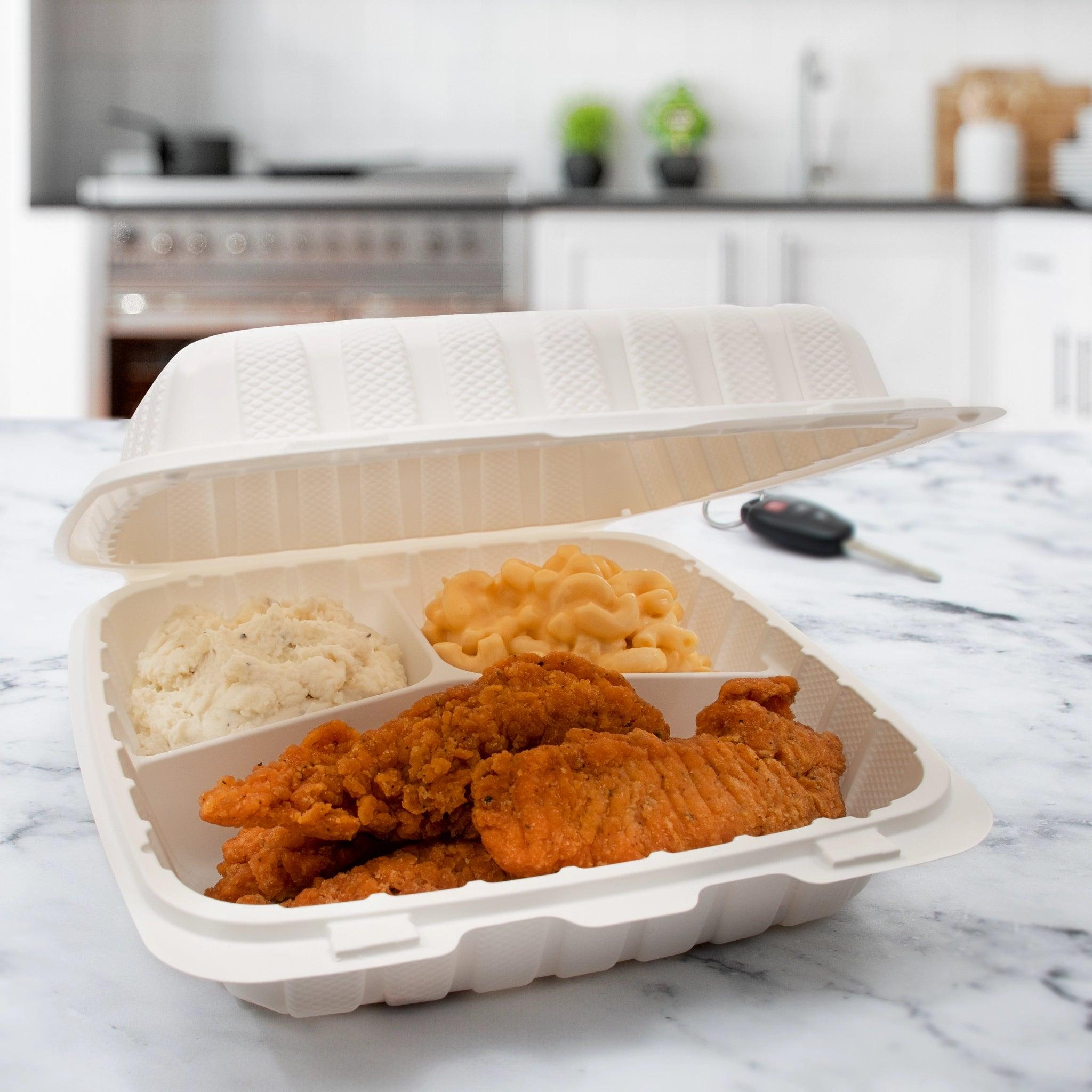 The hinged lid with dual bar snap locks closes securely to prevent leaks during delivery, while the three-compartment design keeps entrées and sides neatly separated. Microwave-safe and reusable, this container is ideal for storing, reheating, and serving a wide variety of meals—from saucy wings to wraps with sides—while using less plastic to help reduce waste.