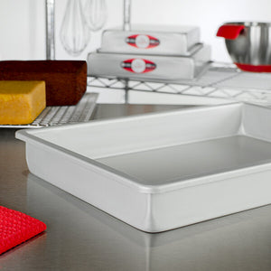 Crafted for serious bakers, the Fat Daddio's ProSeries Rectangle Sheet Cake Pan is designed to deliver consistent results for every recipe. Made from 16-gauge anodized aluminum, it ensures quick heating, even baking, and smooth release without rusting, peeling, or flaking. Its seamless solid-bottom design with straight sides and slightly rounded corners guarantees professional-looking cakes, brownies, cheesecakes, casseroles, and savory dishes. With a wide rolled rim for easy handling and temperature tolerance up to 550°F (285°C), this pan is built bakery-tough to endure daily use in both home kitchens and professional bakeries.