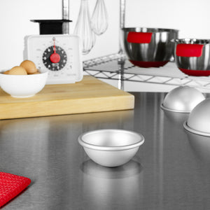 Create perfectly rounded desserts with the Fat Daddio's 3.5" x 1.75" Deep Aluminum Hemisphere Cake Pan. Made from heavy-duty 16-gauge anodized aluminum, this pan is designed for durability, even heating, and long-lasting performance. The rolled rim prevents warping, while the anodized finish ensures effortless release and quick cleanup. Whether you’re making dome cakes, sports ball cakes, or creative 3D desserts, this hemisphere pan delivers reliable results for both professional bakers and home kitchens.