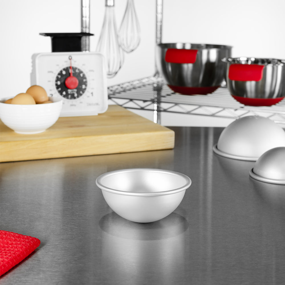Create perfectly shaped desserts with the Fat Daddio's 4" x 2" Deep Aluminum Hemisphere Cake Pan. Constructed from 16-gauge anodized aluminum, this pan ensures even baking and excellent heat transfer. The rolled rim adds durability, while the anodized finish allows for easy release and long-lasting use. Ideal for dome cakes, decorative desserts, and specialty treats, this hemisphere mold is both oven safe and dishwasher safe, making it perfect for home bakers and professionals alike.