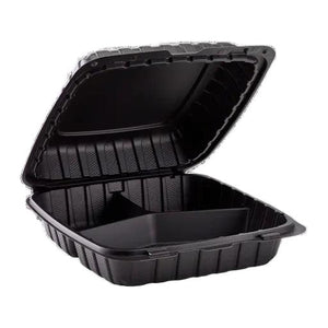 The Rite Brands 8" x 8" Black 3 Compartment Hinged Pebble Container is the perfect solution for serving and transporting meals with multiple portions. Featuring three separate compartments, it keeps entrees, sides, and condiments neatly divided for a fresh and appetizing presentation. Its hinged lid provides secure closure, while the textured pebble finish enhances durability and grip. Ideal for restaurants, catering, takeout, and meal prep, this container ensures convenience and reliability with every use.