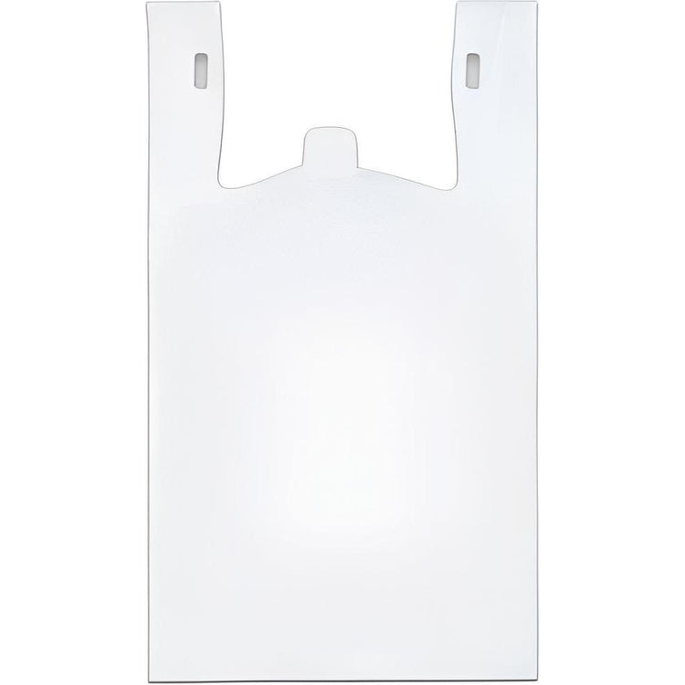 The "T-shirt" style design of these bags offers ease of use and convenience, featuring convenient handles that facilitate comfortable carrying. The ergonomic design allows customers to easily hold and transport their purchased items, making these bags ideal for groceries, clothing, books, and a wide array of retail products. The white color of these bags provides a clean and professional appearance, ensuring a visually appealing presentation for customers. The neutral hue allows for easy customization, enabling businesses to add branding, logos, or labels for promotional purposes or brand recognition.