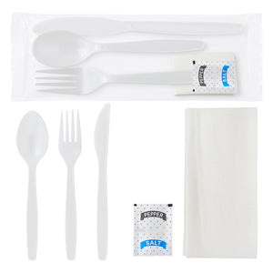 The fork, knife, and spoon included in this kit are made from high-quality plastic material, ensuring they can handle various types of foods without easily breaking or bending. They provide a sturdy and reliable option for enjoying meals on-the-go or in casual dining settings. Moreover, the inclusion of a napkin, salt packet, and pepper packet enhances the convenience of this kit. The napkin offers a practical solution for maintaining cleanliness while dining, while the salt and pepper packets add flavor to meals, providing customers or guests with a complete dining experience.